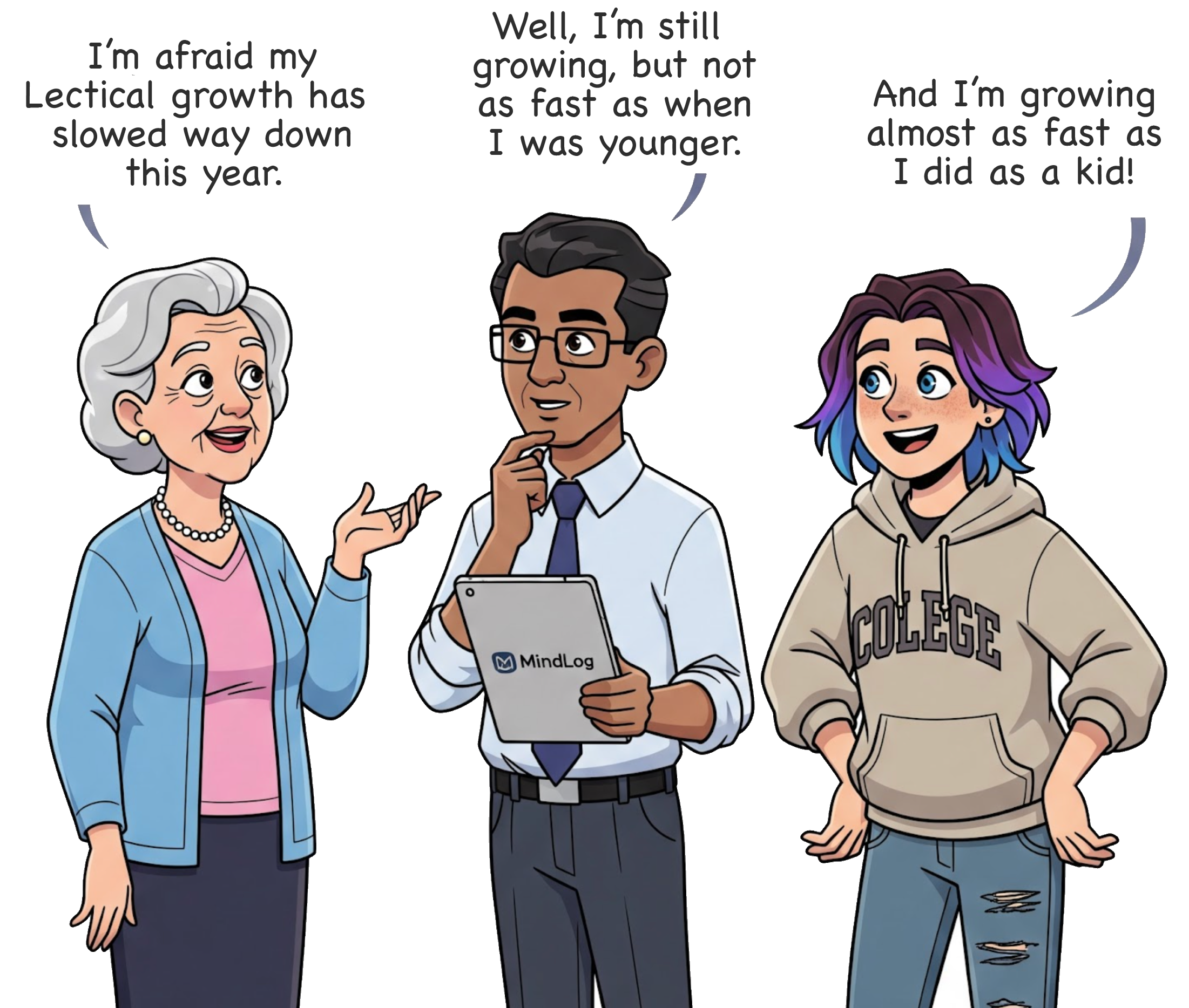 In addition to being variable, mental growth, like physical growth, occurs in fits and starts. A close look at Eve’s growth chart reveals periods of rapid growth followed by periods of slower growth. Researchers have observed similar patterns in older children and adolescents. MindLog makes it possible for researchers to learn much more about these fits and starts, and can even help Mindloggers build skills for managing their own growth more effectively.